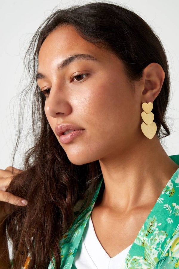 Wauw! Hoe tof zijn deze prachtige gouden statement oorbellen in de vorm van drie gestreepte hartjes. Erg trendy en mega leuk te combineren met meerdere sieraden en accessoires. Deze prachtige oorbellen zijn gemaakt van Stainless steel en hebben een afmeting van 5,3 cm, ideaal om te combineren! Verkrijgbaar in de kleuren: goud en zilver.