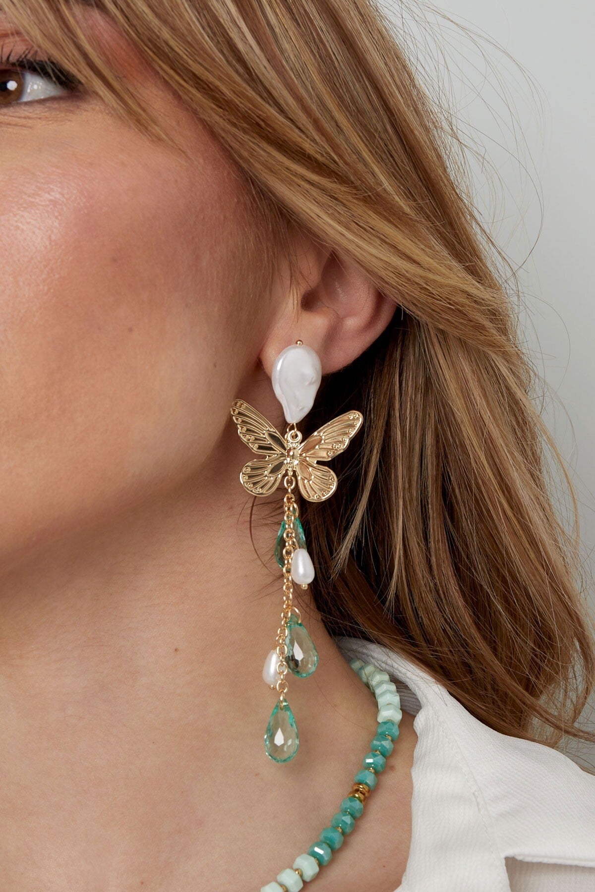 De oorbel is gemaakt van metaal, imitatieparels en glaskralen. De afmeting van de oorbel is 11 bij 3.5 centimeter. Voeg een vleugje glamour toe aan je ensemble met onze trendy oorbellen!